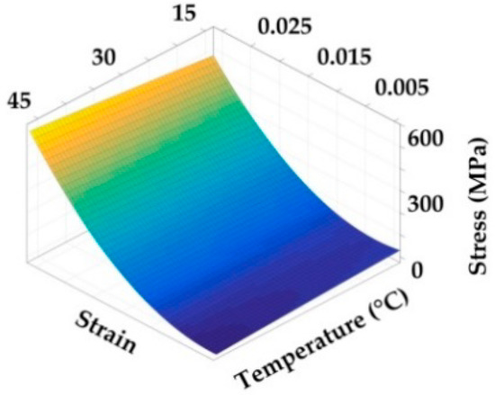 2. Arrange the stress–strain fitting curves in the coordinate system in order of the temperature from low to high. Create an envelope surface for the above three curves. This surface is the stress–strain–temperature characteristic surface of CFPWTP.