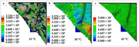 The shear stress distribution at different temperatures: (a) the top view of material at 15 °C; (b) the top view of material at 30 °C; (c) the top view of material at 45 °C.