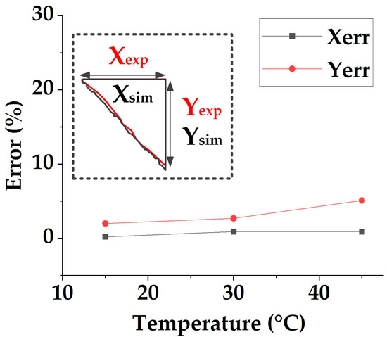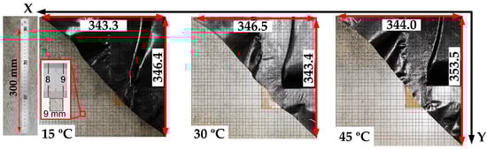 By drawing a grid on the photos, the size of the material is measured, as shown in Figure 17. The size errors of the simulation and test are calculated, and the data are shown in Table 5 and Figure 18. It can be seen that the material length in the X -direction will increase first and then decrease while heating, but the magnitude (about 342 mm) of the change is small (<4 mm). As for the material length in the Y-direction, the length first decreases slightly from 346.4 mm at 15 °C to 343.4 mm at 30 °C and then decreases substantially from 30 °C to 353.5 mm at 45 °C. In addition, overall, the Xerr is generally smaller than Yerr, in which the maximum error in the X direction is 0.9%, while the maximum error in the Y direction is 5.1%. The possible reason for simulation and test difference is that the mold shape makes the material easier to shrink in the Y direction, so the deformation in the Y direction is more significant, bringing more error. As for the shape, it can be seen from Figure 15 that as the temperature rises, the uncovered area at the lower-left corner of the die becomes larger, which is consistent with the trend predicted by the simulations. Finally, by comparing the test results and simulation, it can be seen from Figure 18 that although there are shape deviations, the maximum error is not more than 5.1%, and the simulation and test results show the same deforming trend. Therefore, the model established in this paper can still meet the needs of following defect prediction.