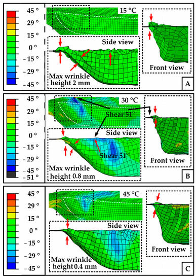 The wrinkle distribution of simulations: (A) the side view and front view of corner material at 15 °C; (B) the side view and frontview of corner material at 30 °C; (C) the side view and front view of corner material at 45 °C.