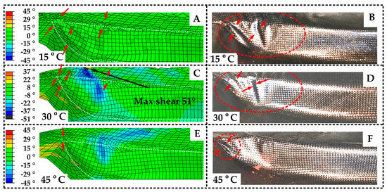 Through quantitative analysis, Figure 19 shows that at 15 °C, the shear angle of every element is below the shear lock angle, but there are obvious folds whose max normal height is about 2 mm. This type of fold belongs to out-of-plane bending, see red arrows. At 30 °C, the material has in-plane and out-of-plane folds. Among them, the most serious out-of-plane fold height is 0.8 mm, and the maximum shear angle of the in-plane fold is 51 °. At 45 °C, the element fluctuation is lower than that of the 30 °C conditions, and the amplitude is less than 0.4 mm. The largest shear angle is 29°. Moreover, as for wrinkles distribution, at 15 °C, folds are mainly distributed at the corner of the front end of the die and the transition area of the side wall. At 30 °C, the out of plane folds are distributed in the transition region, and the in-plane folds are distributed at the left top edge of the mold. At 45 °C, the whole surface is smooth, but there are only small folds at the sharp corners of the mold. Compared with the shear stress distribution of SFABRIC12, the wrinkles’ location shows consistency with the large shear stress position on the mold.
