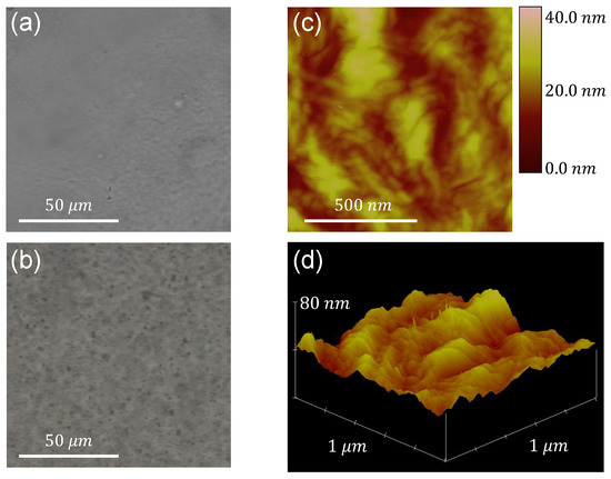 The roughness of each film’s surface is subsequently characterized by means of AFM measurements. A phase image and a 3D plot of the z-coordinate of the film’s surface acquired through this technique are presented in Figure 1c,d, respectively, for the case of the aforementioned sample. Characterization of the roughness of the film’s surface is achieved by determining the (arithmetic average) and (root mean square) roughnesses. Both parameters are calculated using the measurements of the z-coordinate (height) of the surface as follows [31]: