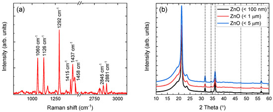 Each sample chemical signature has been verified via complementary Raman and XRD techniques. Raman shift lines, in the range of 800–3100 cm, of the (< 5 m) containing film are depicted in Figure 2a, after fluorescence background subtraction. The observed lines correspond to LDPE and are in very good agreement with the literature [32,33,34,35,36]. The 1060 cm and 1126 cm lines arise from vibrations of the asymmetric and symmetric -C-C stretching, respectively. The characteristic line at 1292 cm, corresponding to the - twisting vibrational mode in the polyethylene crystalline phase, is also clearly resolved. Additional lines at 1415 cm, 1437 cm, and 1458 cm are associated to one wagging and two scissoring modes of the - groups, respectively. Finally, the two lines observed at 2845 cm and 2873 cm are attributed to asymmetric and symmetric stretching, respectively.