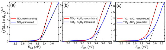 where and , are the reflectance of the sample and reference material, respectively. The results presented in this case are based on higher resolution measurements of diffuse reflectance, in the 250–710 nm range, with a slit width of nm. Tauc plots for the , -, and - samples, of both free-standing and granulated nanoparticles, are presented in Figure 5a–c, respectively. Following the indirect transition for anatase , the Tauc formula here takes the following form [41]:
