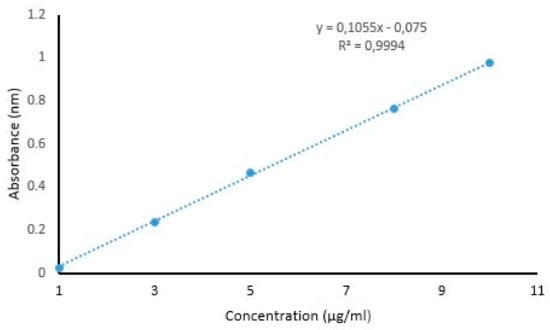 The λmax of HCT was found at 245.0 nm. Based on the λmax, the calibration curve was obtained (Figure 2). This curve confirms that there is a linear correlation between the concentration of the drug and the absorbance (R2 = 0.9994)—i.e., an increase in the concentration of the drug results in an increase in the respective absorbance [58].