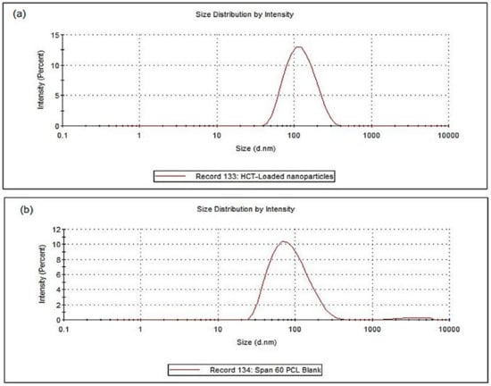 Nanoparticle size of (a) HCT-loaded and (b) SMS-PCL blank nanoparticles.