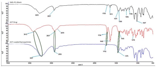 FTIR spectra for HCT, HCT-loaded nanoparticles, and blank (SMS-PCL) samples were obtained and recorded in Figure 4.