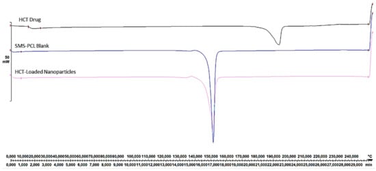 Comparative DSC analyses were performed on all samples. The thermograms obtained were recorded in Figure 5. In the figure, an endothermic peak can be observed at 200 °C, this corresponds with the melting point of HCT at 22 min; this can be corroborated as within the normal melting range of this drug (200–220 °C), per the literature [14,54,55] and confirmed by TGA data. The HCT melting peak is not observed within the polymer, suggesting that this compound is in an amorphous state, further supporting the fact that it has integration within the SMS-PCL nanoparticulate structure [64]. The SMS-PCL nanoparticles demonstrated a sharp peak at 150 °C after 17 min. No secondary peaks were observed, suggesting that the structure melted completely at this temperature [65,66].