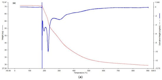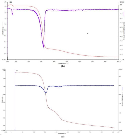 TGA thermograms of pure HCT drug, SMS-PCL blank nanoparticles, and HCT-loaded nanoparticles were undertaken. As seen in Figure 6, the derivative weight (mg/min) peaks represent the critical temperatures in which loss of mass and decomposition occur. With regards to the pure HCT drug thermogram (Figure 6a), three critical weight-loss stages can be observed at 220 °C (onset of decomposition), 305 °C (major decomposition), and, lastly, at 630 °C, where the maximum degradation of HCT is seen. In Figure 6b, the SMS-PCL blank samples show mass loss around 60 °C, which could be as a result of the evaporation of organic solvents and water weight. The polymer shows onset of degradation at approximately 290 °C and maximum decomposition between 320 °C and 500 °C. The HCT-loaded nanoparticles (Figure 6c) exhibit similar thermal behaviour to the blank nanoparticles. In the HCT-loaded thermogram, the degradation of HCT drug was not observed [67].