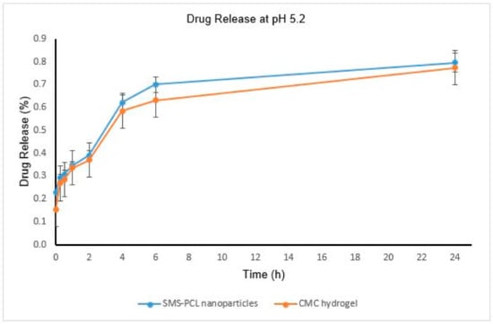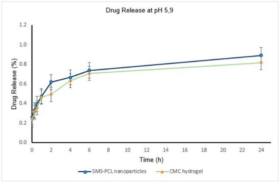 It has also been observed that the HCT drug releases at a faster rate at higher pH (5.9)—which is closer to physiological pH—compared to the low pH for both the nanoparticles and hydrogel formulations [69,76]. The results are presented as mean ± SD (n = 3).