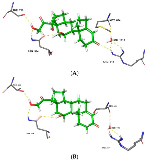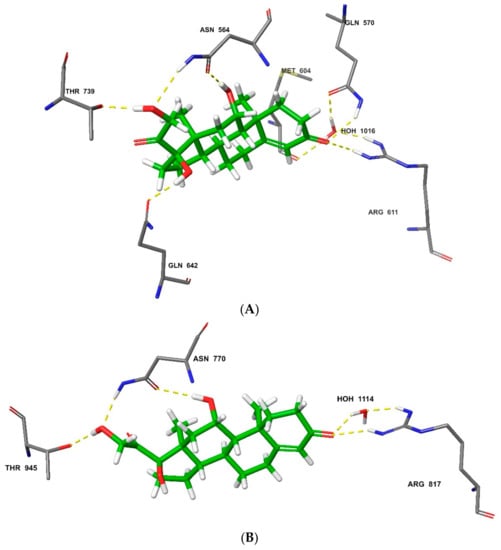 The MM-GBSA simulation revealed more intermolecular interactions between HCT and the receptors, with increased accuracy in binding-affinity prediction. This method showed a better differentiation of HCT binding potential between the two steroid receptors, whereby higher affinity (MM-GBSA-binding score: −79.38 kcal/mol) was obtained for the glucocorticoid receptor compared to the mineralocorticoid target (MM-GBSA-binding score: −66.07 kcal/mol). This proved that the MM-GBSA re-docking method is ideal for ligand-binding affinity and pose prediction [80], and that the glucocorticoid receptor is more selective to HCT than the corresponding mineralocorticoid target [9]. In addition to the hydrogen-bonding amino-acid residues identified in the initial extra-precision docking, MM-GBSA spotted extra others in glucocorticoid-receptor binding, which included Gln642 as well as Gln570, that also participate in the water-induced hydrogen-bonding network (Figure 10A). While no additional amino-acid residue was suggested by MM-GBSA in the mineralocorticoid receptor’s HCT docking, the water-molecule orientation was optimized to initiate formation of the hydrogen bond between the Arg817 residue and the ligand (Figure 10A).