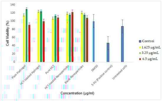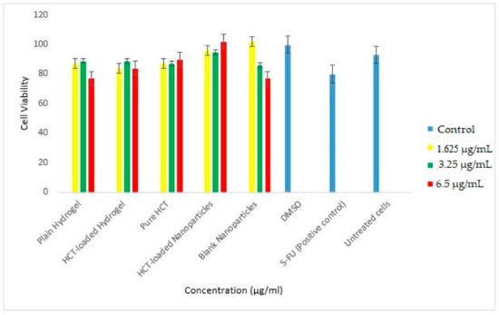The HaCaT cells were seeded in a 96-well plate at a seeding density of 100,000 cells/mL. To each well, 90 µL of the cell suspension was added and incubated at 37 °C, 5% CO2 in a humidified atmosphere for 24 h to ensure attachment of the cells to the plate. Samples were treated with 10 µL volumes, making final concentrations of 1.625, 3.25, and 6.5 µg/mL. Following incubation, the cells were treated with 10 µL of the pure HCT, HCT-loaded nanoparticles, HCT-loaded hydrogel, and blank hydrogel. Negative control samples included blank nanoparticles, DMSO (at 0.03%), and untreated cells. For a positive control, cells were treated with 10 µg/mL of 5-Fluorouracil (5-FU). The treated cells were incubated for a further 24 h. All treatments were performed in triplicates and reported as mean values.