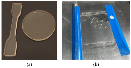 For the mechanical and optical characterization, the electrolyte was casted in an aluminium casting mold to form a 2 mm thick plate of approximately 120 × 120 mm2. The mold was put in an oven at 40 °C for 22 h. After demolding of the cured, elastomeric plate, samples were punched out (Figure 2a). For electrochemical impedance spectroscopy a thin electrolyte film (~130 µm) was obtained by doctor blade method with 175 µm films and a glass rod (Figure 2b). The plate had around 100 °C for a fast curing. Samples of Ø11 mm were punched out. The usual total volume of the mixture was 65 mL to fill the casting mold and prepare the films.