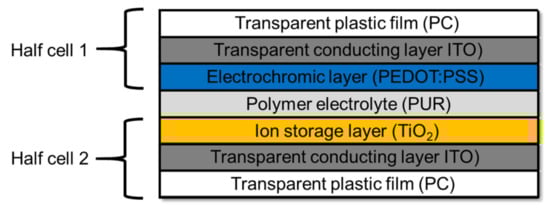 The ECD demonstrator was based on polycarbonate film (500 µm) from Covestro (Leverkusen, Germany). Indium tin oxide (ITO) was used as a transparent conducting oxide and sputtered on the substrate sheets (DIN A3) by Nanogate GfO Systems GmbH (Schwäbisch Gmünd, Germany) with a specified resistance of 25–35 Ω·sq (Elamet Trans B). As a counter electrode, titanium dioxide (TiO2, sheet resistance: >1 × 105 Ω·sq) was coated in a sol-gel process by Fraunhofer ISC (Potsdam, Germany). The electrochromic material PEDOT:PSS (Clevios F AS) from Heraeus (Hanau, Germany) was dipcoated and applied as a working electrode. The electrolyte was dropped on the counter electrode, the working electrode was put on top. Weighted down with a weight it was put in a pressure tank at 0.4 MPa and 40 °C for 22 h in order to cure the electrolyte (Figure 3).