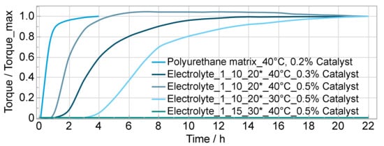 The electrolyte’s curing behavior depends on the curing temperature, the amount of additives and catalyst. Figure 4 shows the relative torque measured in the test chamber corresponding to the curing degree. The results give important information regarding the processing time of the mixture and the curing time. Adding additives or lowering the temperature prolong the curing time, adding more catalyst shortens the curing time. Obviously, at a certain weight portion of additives, the polyurethane matrix does not cure anymore at 40 °C or the polymerization is drastically slowed down, as shown in Figure 4 for the mixture j with 15 wt% salt and 30 wt% solvent. The sameg was observed for the mixtures with a surplus of polyol (stoichiometric ratio 0.85) and a weight portion of 30% resp. 35% additives (h and i). At higher temperatures it is possible to cure the material (the samples for measuring the conductivity were cured at 100 °C while being prepared with the doctor blade method). However, at 50 °C curing temperature or higher the casted electrolyte for preparing the test samples (mechanical, optical and chemical test) showed a nonuniform and uneven surface and at higher temperatures also bubbles. Because of this, and because the material is mostly cured after one day according to the results, the maximum curing temperature for all following experiments was set to 40 °C.