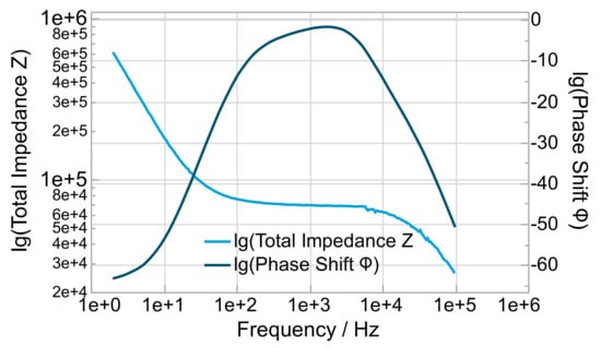 Exemplarily, Figure 6 shows the Bode plot of mixture f (0.85_5_10) with a pronounced plateau to determine the bulk resistance and calculate the specific ion conductivity by Formula (5). In the Bode plot on the primary axis, the logarithm of the total impedance lg Z, and on the secondary axis, the logarithm of the phase shift φ, are plotted versus the logarithm of the frequency lg f.