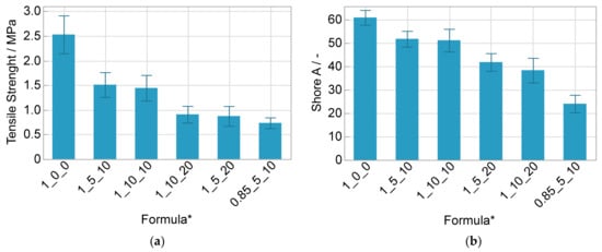 The solvent content has a highly significant negative effect on the tensile strength, whereas the salt content has no effect and an interaction effect could not be observed. Compared to the pure polyurethane matrix the tensile strength decreases by almost 40% at 10 wt% and by almost 65% at 20 wt% solvent content (Figure 8a). The formula with the understoichiometric ratio of the matrix (0.85_5_10) has only half of the tensile strength compared to the formula with the stoichiometric ratio (1_5_10), so it has a major significant impact. The same implications result for the hardness (Figure 8b), which is plausible because normally both properties correlate.