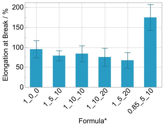 Regarding the elongation at break, the only relevant effect is the one of the stoichiometric ratio (Figure 9). The value more than doubles with a surplus of polyol and reaches more than 170%. Decreasing tensile strength and increasing elongation at break is ascribed to the lower crosslink density of the matrix.