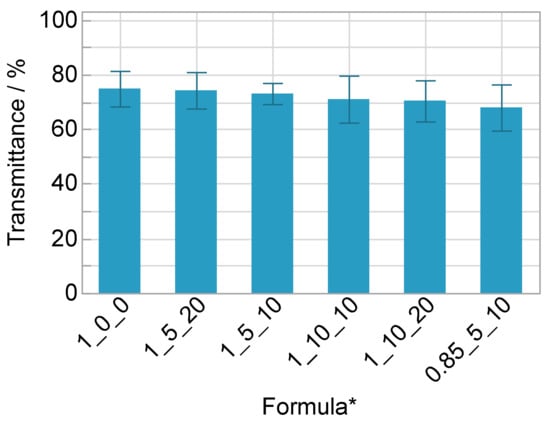 Visible light transmittance according to DIN EN 410 with standard deviation (n = 12); * OH/NCO ratio/wt% salt/wt% solvent.