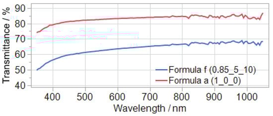 The material with the substoichiometric ratio has a significant lower transmittance (Figure 11 and Figure 12) and L* value as well as a higher b* value (Figure 10) compared to the stoichiometric formula. It should be noted, that the transmittance is negatively affected by the thickness of the sample. The final electrolyte layer in the ECD is much thinner (<100 µm) than the samples measured in this study (2 mm).
