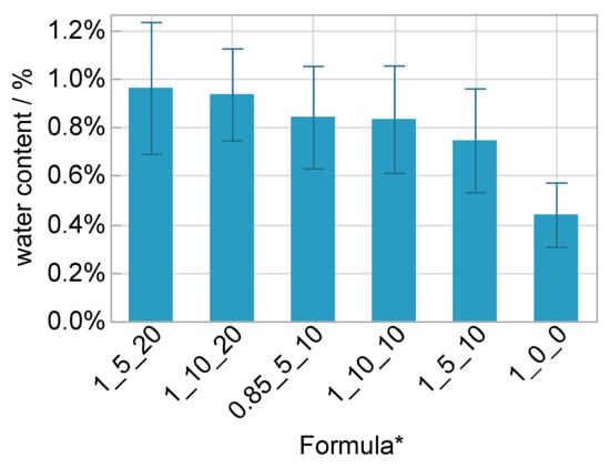 The water content in all electrolyte formulations was between 0.7% and 1.0% and was higher compared to the matrix material (Figure 13). These values are significantly higher than the ones in Section 3.1. One explanation could be that fresh material was used for the atmospheric influence study. Another could be that the humidity in the laboratory at the manufacturing times differed significantly. As described above, salt, solvent and polyurethane components are hydrophilic. The more often the chemical containers were opened in normal atmosphere the higher might have been be the introduction of water. Because of this reason the mixture was heated above 100 °C and evacuated before adding the catalyst as described in Section 2. An extension of the heating and/or evacuating duration could maybe reduce the remaining water.