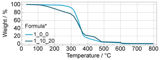 The DSC measurement showed a glass transition temperature of the polyurethane matrix at −7 to −4 °C. The TGA measurement showed a three-stage thermally induced degradation of the matrix (formula 1_0_0), where degradation processes of the first and largest stage started at about 250 °C and reached their maximum degradation rate at about 350 °C until the first stage no longer showed any significant degradation at about 400 °C with a mass loss of more than 80%. During the second step the mass reduced to 5% at 480 °C. At 600 °C the gas switched from inert gas to oxygen, which led to a quick oxidative degradation with a remaining mass of <0.2% (Figure 14).