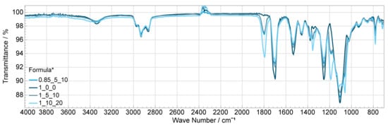 Compared with the electrolyte (Formula 1_10_20), two differences are noticeable. On the one hand, the electrolyte already loses significant mass between 100 °C and 300 °C. Since this mass loss is approximately equal to the solvent content (20%), it is assumed that the solvent volatilizes in this range (boiling point 240 °C). On the other hand, the degraded relative mass during the second stage between approximately 450 °C and 480 °C is higher in the electrolyte. Since the absolute mass of matrix and electrolyte is nearly identical from 480 °C on and a melting point of >300 °C is specified for the conductive salt, it is suggested that the salt degrades there. From Figure 15, the influences of the salt and the solvent on the FTIR spectrum can be studied. Thus, deviating at 1800 cm−1 and at 708 cm−1, one clear peak each can be attributed to the solvent propylene carbonate. The salt shows up as a band at about 1060 cm−1, 1130 cm−1, 1190 cm−1 and 1350 cm−1 [37]. The largest peak at 1100 cm−1 is caused by valence vibrations of the ether bonds –C–O–C– in the polyether polyol component. The peaks at 1245, 1530 and 1695 cm−1 are characteristic of polyurethanes and are due to valence vibrations within the urethane group, e.g., at 1695 cm−1, the vibration of the CO double bond [36]. The peak expressions in the formulas with salt and solvent are smaller the higher the additive amount is, which can be explained by the lower weight fraction of the polyurethane matrix. The small belly at about 2400 cm−1 might be CO2. This is formed especially when isocyanate reacts with water, which may have been additionally brought into the mixture by salt and solvent (both hygroscopic) [38]. Nevertheless, the slightly higher water content in the formulas with additives compared with the matrix is not reflected in the curves. Another possibility is that the atmospheric correction of the spectrometer did not have the same effect on both samples.