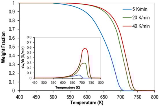 Pyrolysis experiments were conducted under nitrogen with different compositions of three polymers: PP, PS, and LDPE. Table 2 shows six tests of two sets: tests 1–3 (ratio 1:1) binary of PS and PP, and tests 4–6 (ratio 1:1:1) of PS, LDPE, and PP. 10 mg of each powder sample was used throughout the study. Proximate and ultimate analysis that was performed to characterize the polymer samples can be found in reference [16]. Thermal decomposition experiments were conducted under N2 (99.999%) gas flowing at 100 cm3/min using the thermogravimetric analyzer (TGA-7), manufactured by PerkinElmer, Shelton, CT, USA [16].