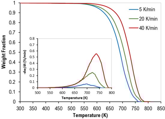 TGA provides us with the thermogravimetric (TG), and the derivative thermogravimetric (DTG) at different heating rates of the pyrolysis of two sets at different polymers compositions, which are shown in Figure 1 and Figure 2, respectively [16].