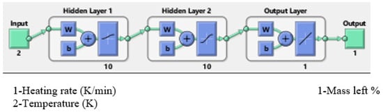 Bi et al. [10] investigated the co-combustion co-pyrolysis of sewage sludge and peanut shell by ANN model. Bong et al. [11] applied the ANN model for the catalytic pyrolysis of pure microalgae, peanut shell wastes, and their binary mixtures with the microalgae ash as a catalyst. In addition, Bi et al. [12] repeated the study for the co-pyrolysis of coal gangue and peanut shell. In both papers, they found there was consistency between the experimental and the ANN model results. Liew et al. [13] predicted the co-pyrolysis of corn cob and high-density polyethylene (HDPE) mixtures, with chicken and duck egg shells as catalysts. Zaker et al. [14] investigated the effects of two catalysis (HZSM5 and sludge-derived activated char) on the pyrolysis of sewage sludge. Dubdub and Al-Yaari [15,16] and Al-Yaari and Dubdub [17,18] tried to use the ANN to predict the performance for different samples. They used a feed-forward LM optimization technique for backpropagation process in the ANN model, in two hidden layers. In the first paper, they applied two input variables, temperature and heating rate, and one output variable, weight left %, while in the second paper, catalyst/polymer weight ratio was added as third input.