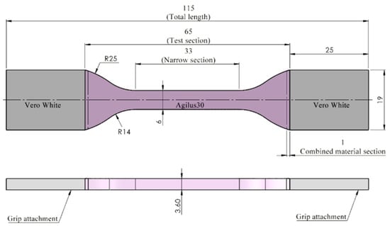 The dog-bone specimen Type IV shape and dimensions according to ASTM Standard D638. Total length 115 mm; test section 65 mm; narrow section 33 mm; grips attachments 26 mm × 19 mm; combined material section 1 mm; width; 6 mm; thickness 3.6 mm.