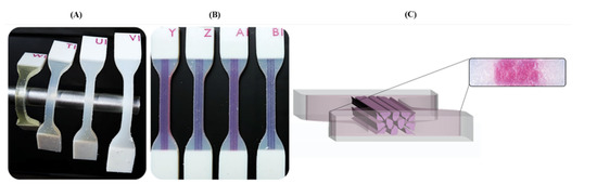 On the other hand, there was the option of manufacturing a composite material using the J750™ DAP capabilities, combining a hard phase (a rigid plastic) and a soft phase (a rubber-like). However, this approach presents several disadvantages such as material transitions, compatibility, or hard phase fracture. The use of a composite material with these drawbacks would lead to premature failure of the construct by subjecting it to large deformations. overcoming these limitations, our approach was the most suitable option for manufacturing the structure, when comparing the soft tissue-mimicking specimens to native tendons and ligaments, this method suggests that Stratasys J750™ DAP and its rubber-like materials can create constructs that approach the targeted tensile mechanical response of these structures. Although quantitatively our mechanical values are not close to those reported for real tissues, the stress–strain curves reported may overlap. Except for the typical toe region, soft tissue-mimicking specimens behave similarly exhibiting a proportional elastic region, a non-well-defined plastic region, and strength and failure limits. Moreover, the mechanical properties reported in this study and those described in the literature for related soft tissue applications are similar to, for example, HydroThane™ (hydrophilic thermoplastic polyurethane), a material used to fabricate soft-tissue medical devices [76,77]. The described method could be adapted to the clinical and research needs of 3D printed soft tissue anatomical models. Finally, additional mechanical characterization tests, such as compression and fatigue, will increase the understanding of the behavior of the polymeric materials described in this study.