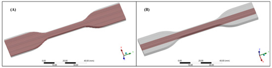 View of the dog-bone specimens used in Finite element analysis at Ansys structural environment. (A) Pattern configuration I fibers are uniformly distributed along the entire specimen’s volume (B) Pattern configuration II fibers are positioned only in the narrow cross-section of the specimen.