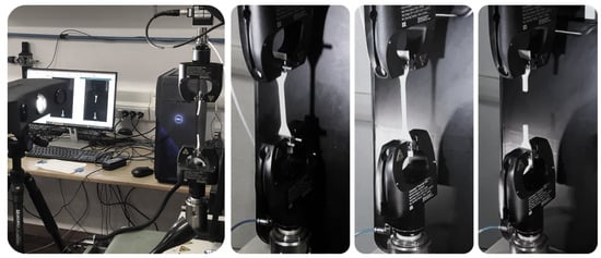Experimental mechanical testing setup. The deformation of the dog-bone specimen in the initial elastic stage until failure is shown.