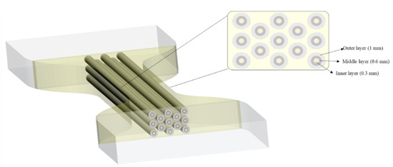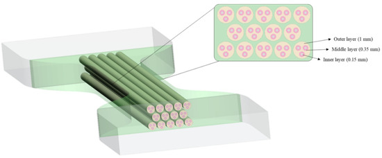 The third approach followed a natural arrangement, which was titled Bamboo-Like (BL) pattern. It mimics the concentric layer arrangement of the bamboo fibers. The selection of the bamboo architecture was based on the exceptional structural efficiency in terms of mechanical performance per unit weight of bamboo. This property derives from the optimization of their cellular microstructure and tubular macroscopic shape [70]. The BL hierarchical structure was designed by recreating 13 fibers of bamboo in the CSA of the specimens, each of them containing three concentric layers as shown in Figure 7. The design specifications according to the Shore A harness are given in Table 3. The bamboo cortex fibers are hollow tubes composed of several concentric layers and each layer is reinforced with helically wound microfibrils (or protofibrils) [71].