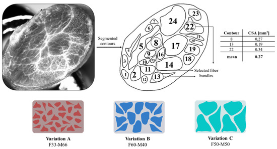 Our second approach was titled Tendon-Mimic (TM) pattern; it was designed by mimicking the non-uniform fascicle dimension of equine superficial digital flexor tendon (SDFT), examined using an SMZ18 Research Stereo Microscope. The fascicles were segmented on Rhinoceros 3D software to calculate the CSA of each fascicle’s silhouette. Subsequently, three fascicles were chosen, which showed a more regular shape and had a CSA close to the mean. By modifying the dimension of the three fascicles, some variants were created, considering the percentage of area that was occupied by the fibers on the narrow cross-section of the specimen. Thus, a fibers percentage of Variant A (50%), Variant B (60%), and Variant C (33%) were considered as shown in Figure 6. The design specifications according to the Shore A hardness values assigned are given in Table 2.