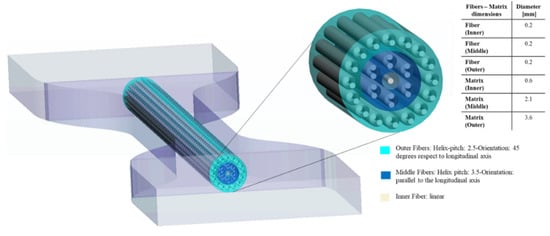 Our last pattern, titled Helix Bamboo-Like (HB) pattern, considers a single bamboo fiber that is composed of three nested layers. Considering the bamboo microstructure, the two outermost layers contain fibers with a double helix configuration. In particular, the helix pitch selected was 2.5 and 3.5 for the external and the middle layer, respectively, while in the innermost layer there is a single cylindrical fiber as shown in Figure 8. As regards, HB specimens there were considered the same values of Shore A hardness for the specimen matrix and fibers, while the matrix of each layer was set with different Shore A values as shown in Table 4.