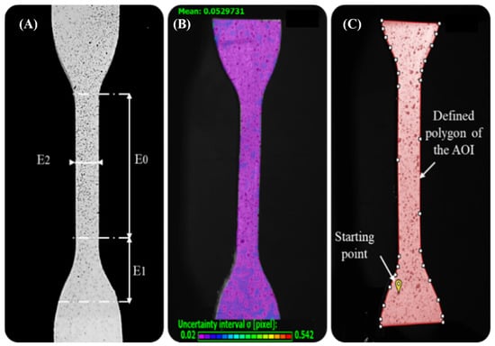 Implementation of the Digital Image Correlation (DIC), main stages. (A) Speckle pattern applied on the dog-bone specimen Type IV surface before the tensile test, the defined position of the virtual extensometers E0, E1, and E2 are along the XY axes in the regions of interest. (B) Image acquisition of the specimen, uncertainty range in the correlation of subsets in images; purple: maximum correlation-red: none. (C) Post-processing phase. Area of Interest (AOI) on which VIC-3D performs correlation analysis. defined by a polygon on the specimen surface image. Likewise, the starting point is evidenced placed in the area of the image that is subjected to the least amount of movement (grip attachment) during the tensile test.