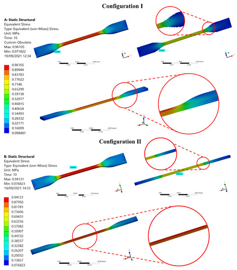 The simulation aimed to determine the appropriate position of the pattern before 3D printing the test pieces. An assessment of the influence of internal pattern placement (using a uniform diameter ø fiber pattern) within the entire test piece through both configurations is presented in Figure 10. In general, both test piece in-silico models exhibited, as expected, the highest stress values distributed along the test section. The numerical results in both configurations were similar, however, their location was different. The higher-stress values evidenced in the configuration I (0.89–0.96 MPa) were located in the change of CSA between the narrow section and the grips attachment. In this arrangement, as shown in Figure 3A, the fibers placed in the region of curvature of the test piece were not the same length as those placed along the narrow section, as well as these were not constrained by one of their ends. Then, in the shorter fibers that were subjected to uniaxial tension, shear stress was generated in correspondence with the joint radius, which caused a deficiency in this area of the specimen. On the other hand, configuration II, whose fibers arrangement was placed exclusively along the narrow section across the specimen as shown in Figure 3B, exhibited the higher-stress values (0.87–0.94 MPa) in the central region of the test piece as is expected during the mechanical tensile test. As known, mechanical test results could vary depending on the test piece geometry design and manufacturing process. Consequently, seeking repeatable comparative results and parameters we selected configuration II for multi-material 3D printing of the patterned specimens. This arrangement showed the Von Mises Stresses distribution proportional to the uni-axial applied load during the tensile test, evidencing the highest values in the central region (CSA is reduced as the strain increases) following the deformation of the test piece until its failure. These results were consistent with guidelines and recommendations specified in the standard preventing thus, early specimen failures during tensile testing in regions where there are CSA changes.
