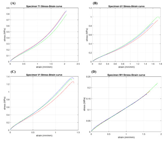 The stress–strain curves obtained after mechanical testing of base PolyJet materials. Specimens ID: (A) T1 = Agilus30™ base material-Shore hardness selected A50. (B) U1 = Agilus30™ base material-Shore hardness selected A60. (C) V1 = Agilus30™ base material-Shore hardness selected A70, and (D) W1 for TissueMatrix™.