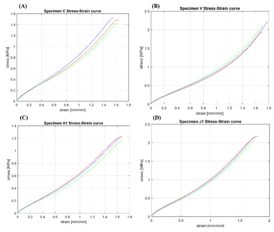 The most significant stress–strain curves obtained after mechanical testing of patterned specimens. (A) Tendon-Like (TL) pattern: C = Inner Layer: Shore hardness A70—Middle Layer: Shore hardness A60—Outer Layer: Shore hardness A70, and Matrix: Shore hardness A60. (B) Tendon-Mimic (TM) pattern: V = Variant %: Fiber 60%—Matrix 40%, Fiber: Shore hardness A70, and Matrix: Shore hardness A50. (C) Bamboo-Like (BL) pattern: A1 = Inner Layer: Shore hardness A70—Middle Layer: Shore hardness A60—Outer Layer: Shore hardness A70, and Matrix: Shore hardness A60. (D) Helix-bamboo (HB) pattern: J1 = Inner Layer: Shore hardness A50—Middle Layer: Shore hardness A60—Outer Layer: Shore hardness A70, Fiber and Matrix: Shore hardness A60.