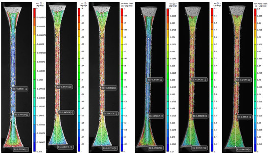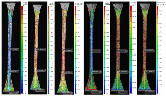 The advanced DIC non-contact instrumentation was used as a precise method to track and analyze in detail the volumetric deformation of patterned specimens during mechanical tensile testing. The set of representative images of each type of proposed pattern (A to S1) was stored and analyzed during the image acquisition and post-processing phases. The average values computed for the longitudinal, normal, and Von Mises strain fields (exx, eyy, and eeq) along with Poisson’s ratio of the most significant specimens were reported in Table A3 (Appendix A), in addition to the values recorded by the virtual extensometers positioned in the regions of interest, that were used to calculate the Poisson’s ratio and for the comparative analysis of the values found in the strain fields. Moreover, the coefficient of variation (CV%) was reported to assess the variability of the measurements. The DIC strain fields shown in Figure 13 and Figure 14 taken in that exact frame are representative of one of the three specimens tested in a condition of maximum apparent elastic load before specimen rupture.
