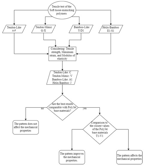 The results obtained from the mechanical tensile test are presented as follows. Figure 15 shows the methodology selected for the analysis. The mechanical tensile response of the base PolyJet materials, as well as the proposed soft tissue-mimicking polymers, was determined and the results compared.