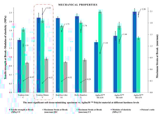 The experimental results of the best soft tissue-mimicking specimens and the Agilus30™ base PolyJet material at different Shore A hardness levels were summarized and compared as shown in Figure 16. The specimens V (Tendon-Mimic) showed best balanced mechanical properties reflected in terms of higher values of modulus of elasticity (MPa), maximum strain at break (mm/mm), and values of tensile strength at break (MPa) along with those evidenced by specimens J1 (Helix-Bamboo). Likewise, comparing them with the Agilus30™ base PolyJet specimens. These presented slightly higher values of modulus of elasticity (MPa) and near values of tensile strength at break (MPa) to the hardest combination, Agilus30™ A70 base material. Evaluating its maximum strain at break (mm/mm), although it is not close to the values reported by the Agilus30™ A50 base material, the softest one, it exceeds the Agilus30™ A60 and A70 combinations.
