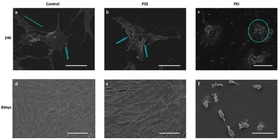 Scanning electron micrographs (SEM) of MSCs grown for 24 h and 8 days on glass (a,d), PSS-ended (b,e), and PEI-ended (c,f) slides. Scale bar: control and PSS, 80 µm; PEI, 40 µm. Cyan line, arrows, and circle show cell morphology on three different substrates.
