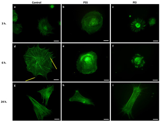 Representative images of the cytoskeleton structure of MSCs after 3 h, 6 h, and 24 h of culture time on glass slides (a,d,g), PSS-ended slides (b,e,h), and PEI-ended (c,f,i) slides. Green represents a FITC-phalloidin stain of the actin cytoskeleton. Scale bar: 5 µm. Yellow arrows show stress fibers and filopodia formation.