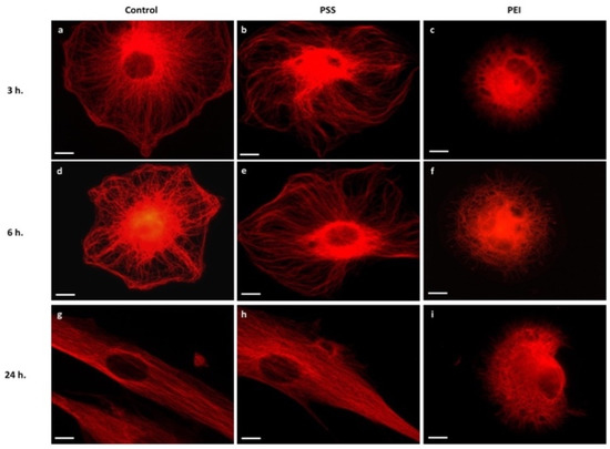Representative images of cytoskeleton structure of MSCs after 3 h, 6 h, and 24 h of culture time on glass slides (a,d,g), PSS-ended slides (b,e,h), and PEI-ended (c,f,i) slides. Red represents anti α-tubulin and Alexa Fluor 594 stain of microtubules. Scale bar: 2 µm.