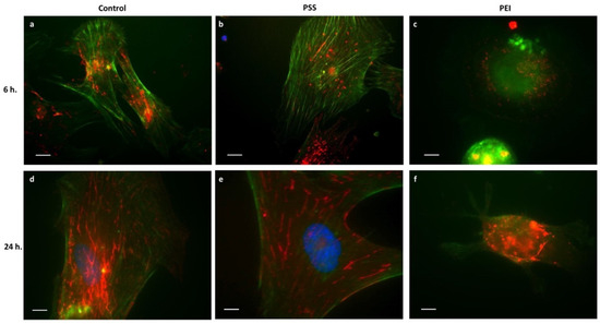 Distribution of Integrin α5ß1 (red fluorescence) and actin (green fluorescence) in MSCs after 6 h and 24 h of culture time on glass slides (a,d), PSS-ended slides (b,e), and PEI-ended (c,f) slides Blue represents DAPI stain of nuclei. Scale bar: a and b = 5 µm.