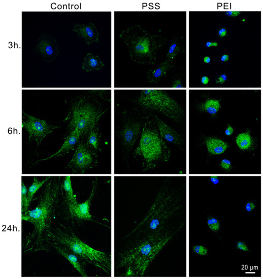 Representative images of MSCs after 3 h, 6 h, and 24 h of culture time on glass slides, PSS-ended slides, and PEI-ended slides. Green represents FITC-conjugated antibody stain of FAK, blue represents DAPI stain of nuclei. Scale bar: 20 µm (for all the images shown).