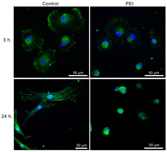 After 3, 6, and 24 h, they assumed an elongated morphology with regular and numerous stress fiber formation (Figure 2b,e,h). On PEI-ended slides, the MSCs, after 3 and 6 h (Figure 2c,f), instead showed a rounded morphology with a distribution of fluorescent protrusions that were extended radially in the periphery. After 24 h some cells spread on the substrate and displayed long protrusions and numerous filopodia, without stress fibers, but with an evident actin cortex (Figure 2i). These results revealed that PEI had a strong, hindering effect on the correct formation of stress fibers, expected, in turn, to severely affect the cell cytoskeletal functions.